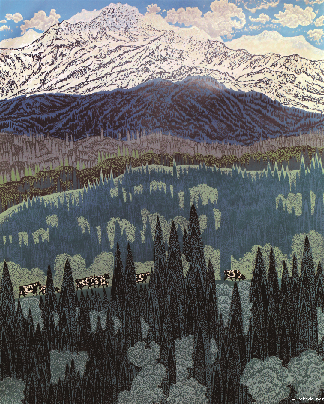 张艺(新疆维吾尔自治区) 云过慕士塔格 套色木刻 90cm×70cm 2019 年